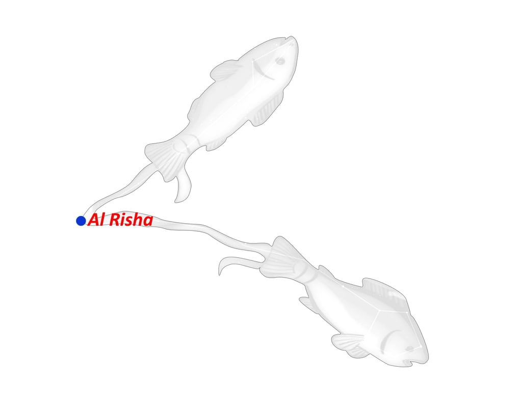 Al Rescha, o Al Rischa, derivado de los árabes 'Al Risha', el Cordón, está 20 ° al sur de la cabeza de Aries, 2 ° .7 al norte del ecuador celeste, y marca el nudo en los cordones unidos de los Peces. ; el mismo título se aplica a beta (β) Andromeda (Mirach). Esta palabra originalmente puede haber venido del babilónico Riksu, Cord.