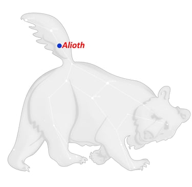 Epsilon (ε) Ursa Major, Alioth, es una estrella situada en la raíz de la cola de la Osa Mayor, en la parte más gruesa de la cola.