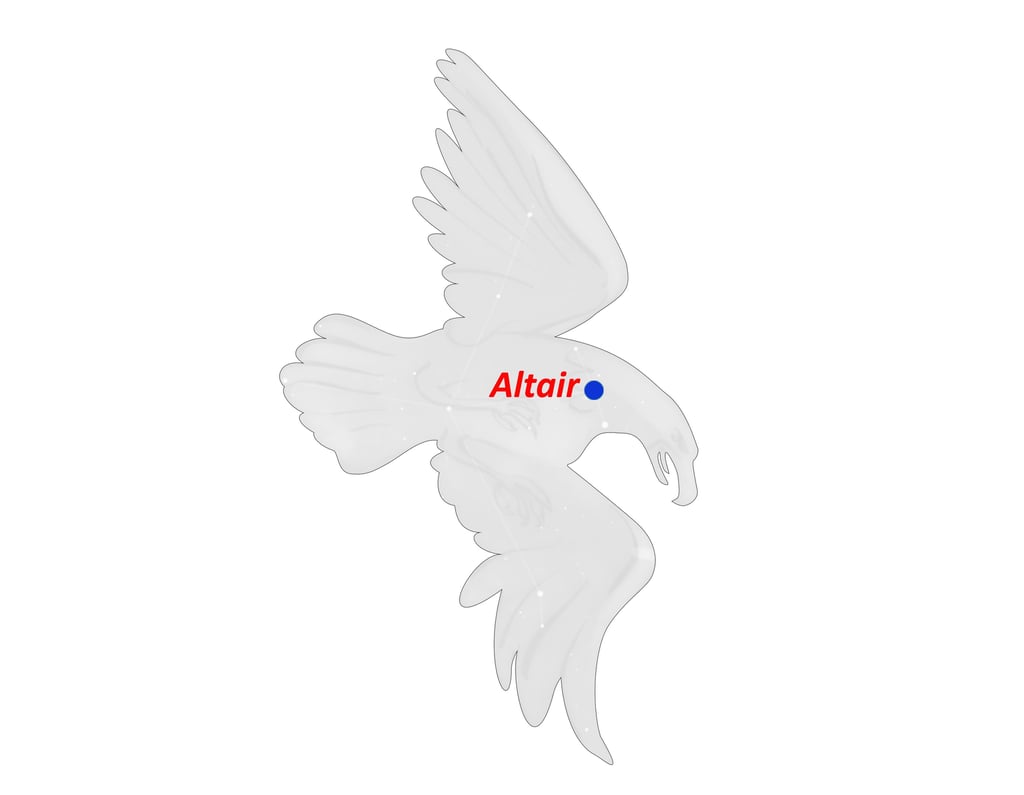 Altair, en el Águila, también llamado el Águila Voladora, tiene un carácter Marciano con una mezcla de Mercurio y Júpiter. Atado con cuerpos estelares benéficos, Altair es acreditado por otorgar resistencia, coraje y generosidad, especialmente si está en el Ascendente. Altair es bueno para el avance de los abogados y militares.