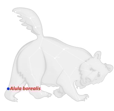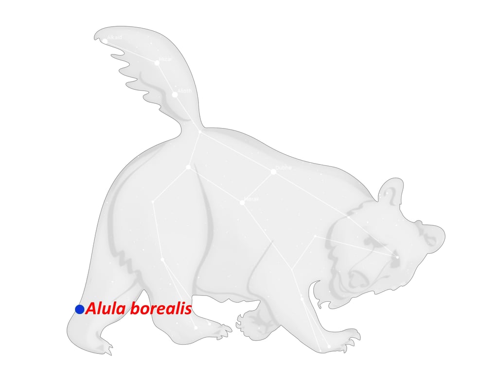 Nu (ν) Ursa Major, Alula Borealis, es una estrella doble, 3.5 y 12, naranja y azul cerúleo, que marca la pata trasera izquierda de la Osa Mayor.