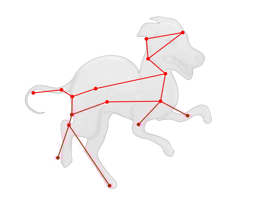 Leyenda: Se dice que esta constelación representa al perro puesto por Júpiter para proteger a Europa, a quien había robado y transportado a Creta. Sin embargo, según otros relatos, fue Laelaps, el sabueso de Acteón; el de Procris, la ninfa de Diana; el que le dio Aurora a Céfalo; o finalmente uno de los perros de Orión. [Robson, p. 34.]