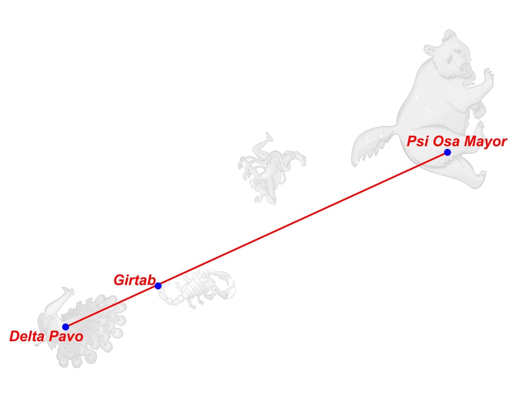 Ártemis (Delta Pavo) salió al encuentro de Heracles y le reprendió (Girtab) por haber maltratado a su animal sagrado (Psi Osa Mayor), pero él alegó que lo había hecho por pura necesidad, e hizo recaer toda la culpa sobre Euristeo. Así aplacó la ira de la diosa, quien le dejó que llevara la cierva viva a Micenas.
