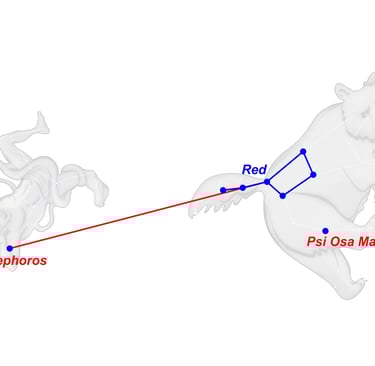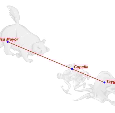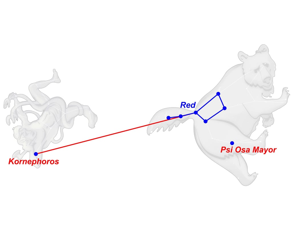Estaba consagrada a Ártemis (Peacock), que de niña había visto cinco ciervas (Mizar, Alioth, Megrez, Merak y Phecda), más grandes que toros, paciendo en las orillas de guijarros negros del río tesalio Anauro, al pie de los Montes Parrasios, mientras el sol centelleaba en sus cuernos. Corrió en su persecución y atrapó a cuatro de ellas, una tras otra, con sus propias manos, y las unció a su carro; la quinta huyó a través del río Celadón a la Colina Cerinia (Phecda), tal como había previsto Hera, quien ya pensaba en los trabajos de Heracles.