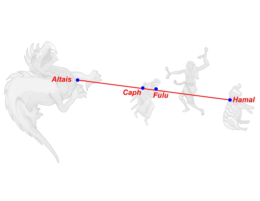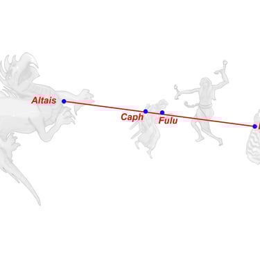Cuando Heracles fue a visitar a las amazonas, todas ellas habían vuelto ya al río Termodonte y sus tres ciudades estaban gobernadas por Hipólita (Mirach), Antíope (Nu Andrómeda) y Melanipa (Mu Andrómeda). En el camino hizo un alto en la isla de Paros, famosa por sus mármoles, que el rey Radamantis había legado a un tal Alceo, un hijo de Androgeo; pero cuatro hijos de Minos, Eurimedonte (Etamin), Crises (Kuma), Nefalión (Grumium) y Filolao (Alwaid), también se habían establecido allí. Cuando dos marineros de la tripulación de Heracles desembarcaron para ir en busca de agua y resultaron asesinados por los hijos de Minos, indignado mató a cuatro de ellos y apremió a los parios de tal modo que enseguida le enviaron mensajeros ofreciéndole a cualesquiera dos hombres que eligiera para que fuesen sus esclavos en compensación por la muerte de los marineros. Satisfecho con esta propuesta, Heracles levantó el sitio a la ciudad y eligió al rey Alceo (Alwaid) y a su hermano Esténelo (Kuma) a quienes llevó como esclavos a bordo de su barco. Luego navegó a través del Helesponto y el Bósforo hasta Mariandino, en Misia, donde le hospedó el rey Lico (Alderamín) de Paflagonia, hijo de Dáscilo y nieto de Tántalo. En recompensa, apoyó a Lico en una guerra contra los bébrices, matando a muchos de ellos, incluido su rey Migdón, hermano de Ámito, y reconquistando gran parte del territorio de la Paflagonia que estaba en poder de los bébrices; se lo devolvió a Lico, quien, en su honor , llamó Heraclea a esta región. Más tarde Heraclea fue colonizada por los megarenses y tanagrenses por consejo de la Pitonisa de Delfos, quien les dijo que instalaran una colonia junto al Mar Negro, en una región dedicada a Heracles.