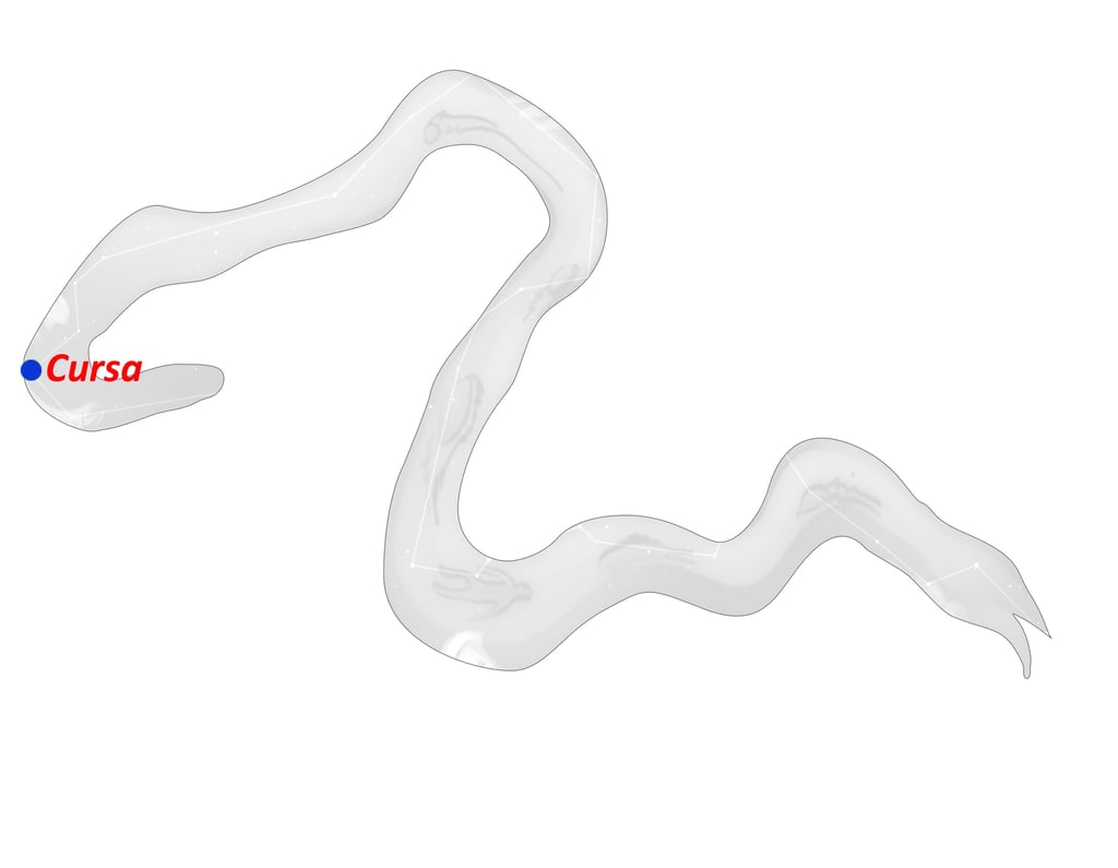 La estrella Cursa está al principio del rio, justo al lado de la estrella Rigel, que está en el pie de Orión. Se localiza al sur de la eclíptica fuera del paso de los planetas. Se trata de una estrella blanca del tipo A0, parecida a Sirio, Vega o Altair, cuya influencia aumenta la posibilidad de ser célebres si se encuentra en un ángulo en el cielo natal.