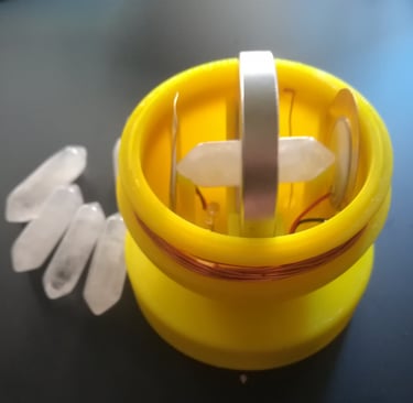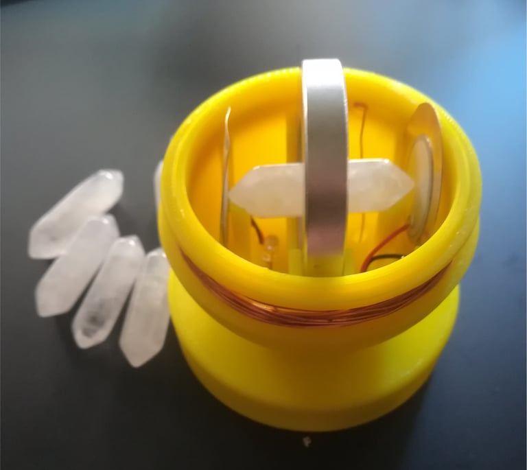 Su señal pulsante se genera por un NE555 y se transmite mediante una bobina y discos piezoeléctricos conectados en serie. El cuarzo axial y un aro magnético complementan la modulación del campo energético, actuando como resonadores naturales que amplifican la coherencia vibracional. Está orientado a sesiones personales de exploración somática o prácticas meditativas.