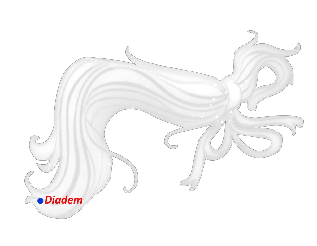 Alpha (α) Coma Berenices, Diadem, se refiere a la corona de joyas en el cabello de Berenice.