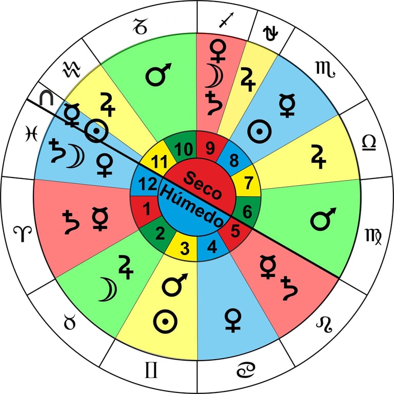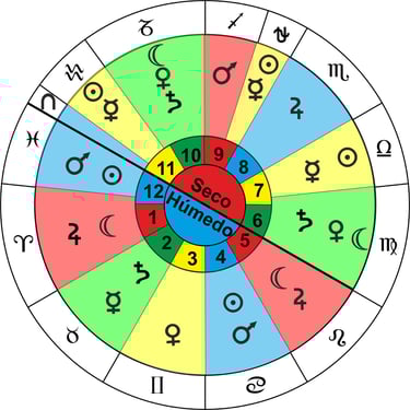 Al haber un lado húmedo y otro seco, Piscis está partido por ésa línea, por lo que hay dos planetas diferentes, es decir, son dos signos diferentes, Pegaso en el lado seco y Piscis en el lado húmedo, pero con el mismo regente, en este caso Júpiter.