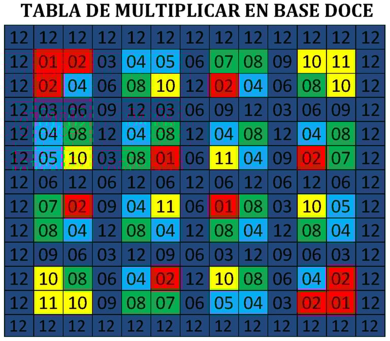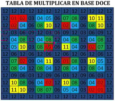 Tomo la tabla de multiplicar reducida del 1 al 12. (reducida es: 5x3=15 pero en base doce es 13, por lo que me quedo con el último dígito que es 3).
