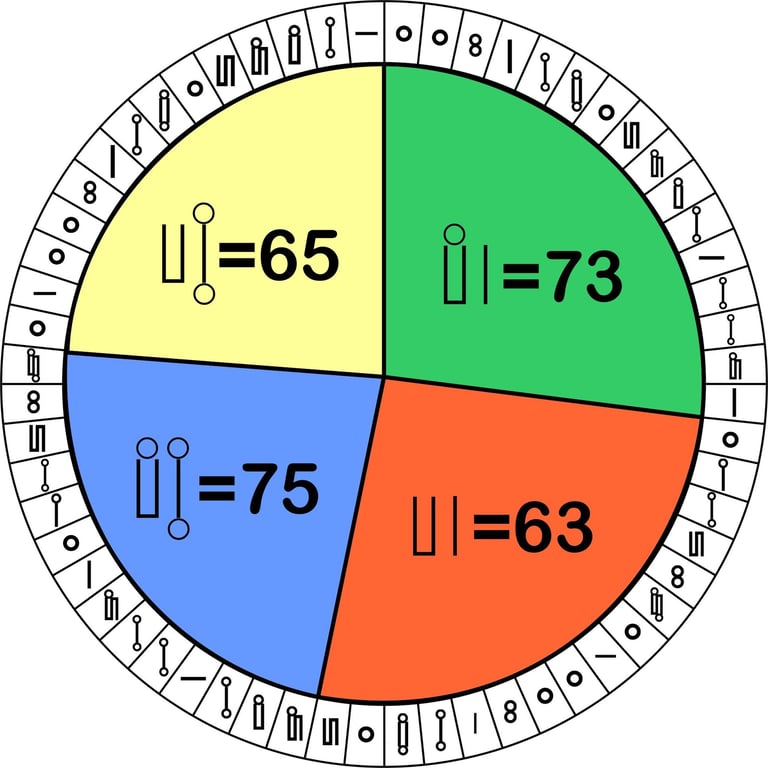 Divido el círculo en cuatro porciones y la suma de los dígitos de cada porción da unos valores en base doce correspondientes a las cualidades primitivas que componen los diferentes elementos.