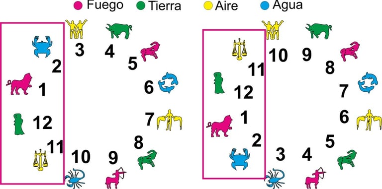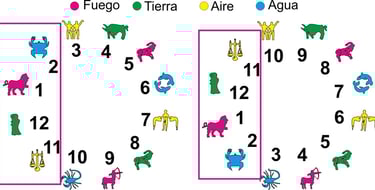 Si comparo las constelaciones con los signos zodiacales y los relaciono con la rueda zodiacal, se puede observar que los signos de Cáncer, Leo, Virgo y Libra quedan en sentido inverso a una rueda zodiacal normal.