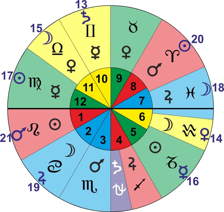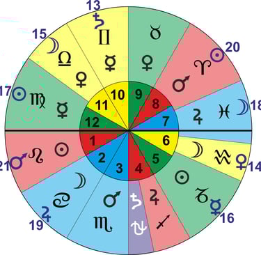 En la imagen se puede observar los planetas en los diferentes signos zodiacales, empieza por el 1 Leo y sigue la numeración hasta el 21 Leo.