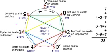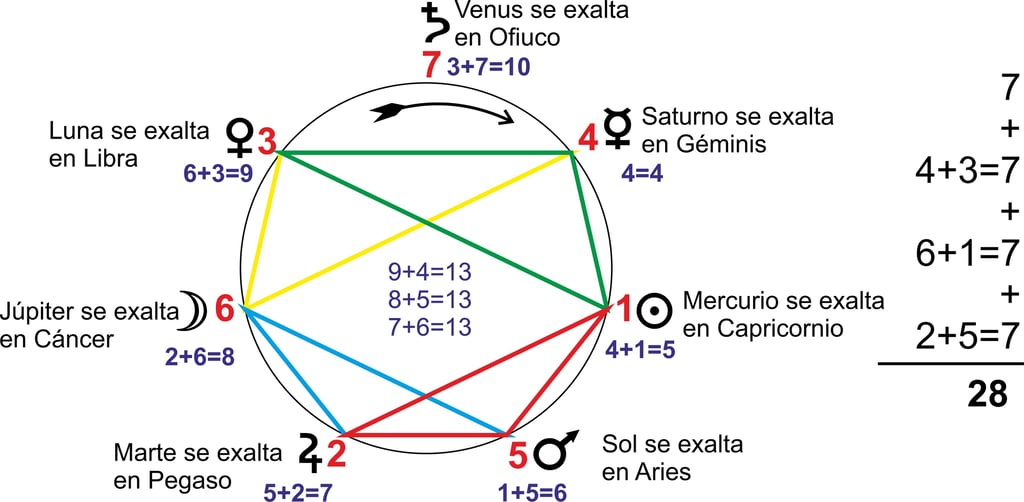 Si formo una estrella de 7 puntas, la numero del 1 al 7 y voy poniendo los planetas empezando por el Sol como número 1, y hago las exaltaciones de los planetas, de tal manera que queda la suma del planeta con el signo en color azul. Si sumo en horizontal los números rojos los resultados son cuatro 7 que da un monto de 28, la duración de un ciclo lunar.