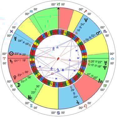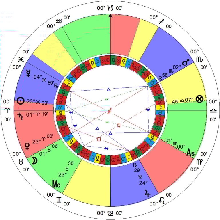 En este apartado se muestra la carta astral como fondo en un software de astrología. Es una carta cero grados Aries y sistema de casas iguales.