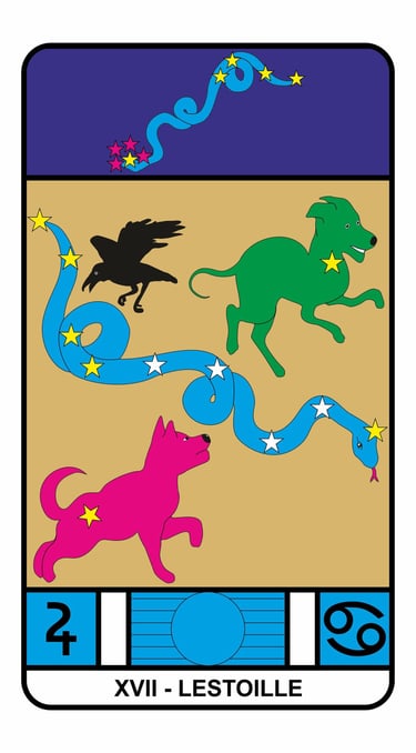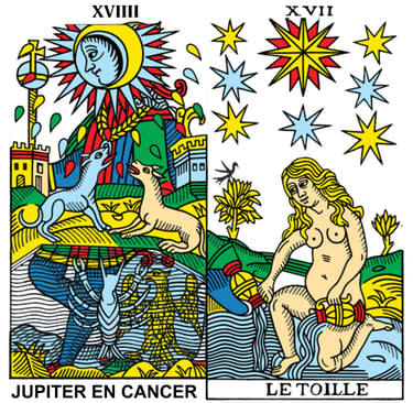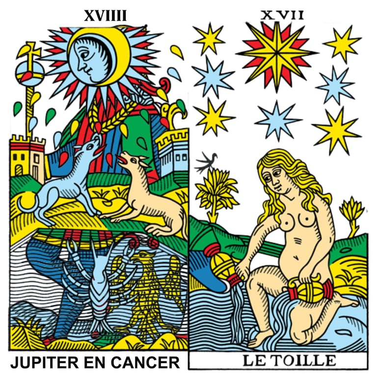 El Emperador es Júpiter, mientras que la carta superpuesta es la Luna que es regente de Cáncer.