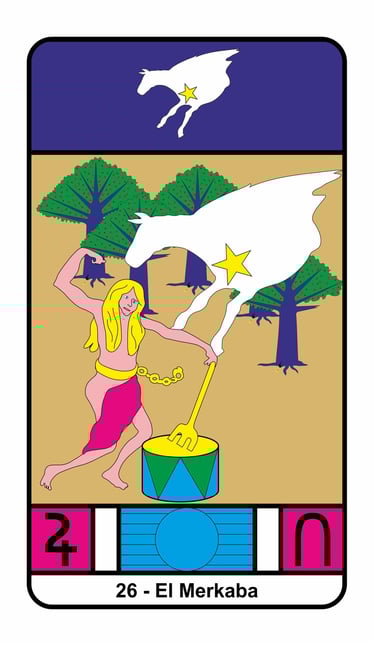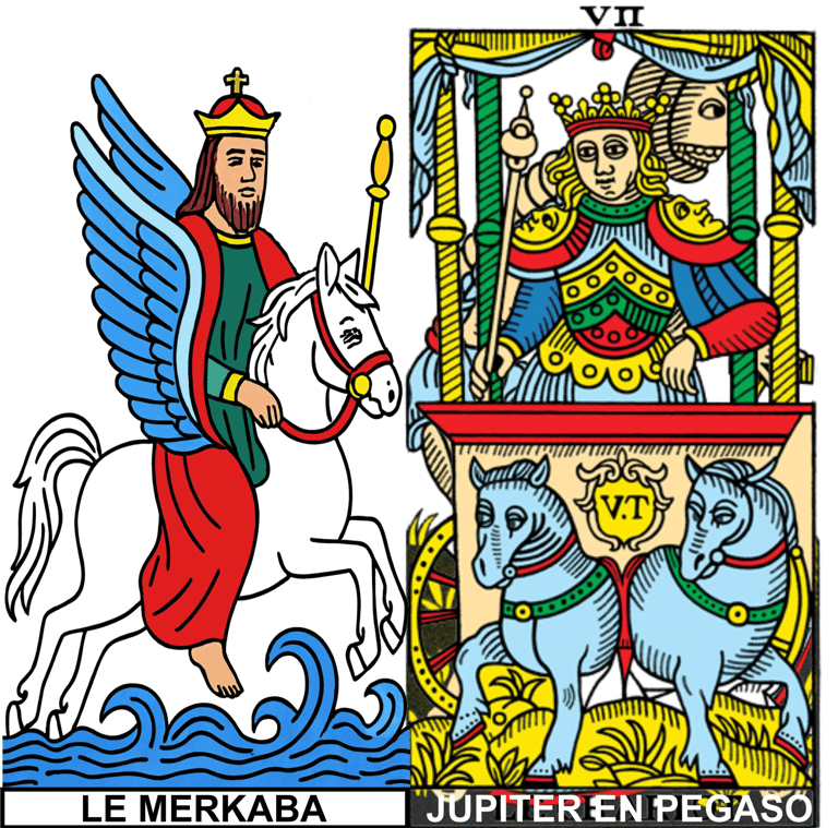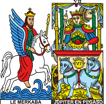 La carta de abajo es la Muerte y representa a Pegaso, mientras que la que esta superpuesta es el carro y representa a Júpiter.