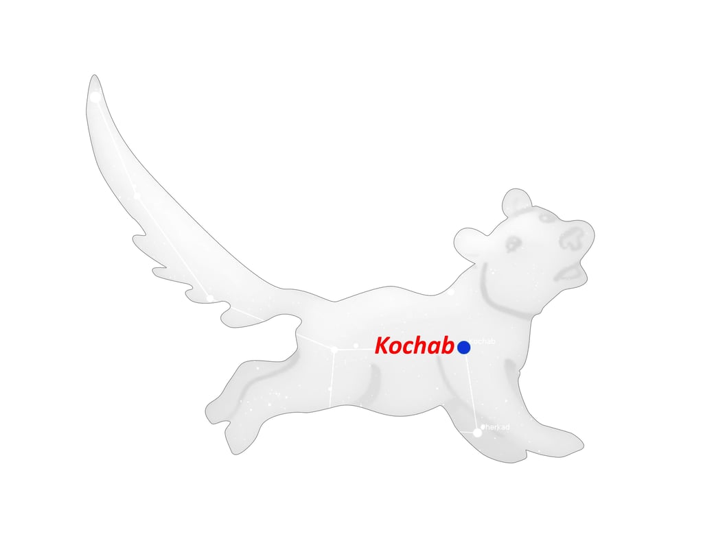 Beta (β) Ursa Minor, Kochab, es una estrella rojiza en la cadera delantera derecha de la Osa Menor.