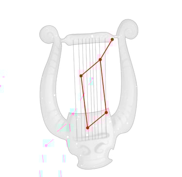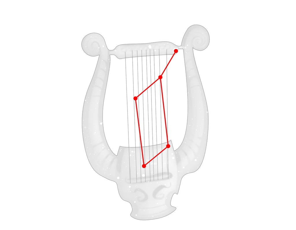 Leyenda: Mercurio encontró el cuerpo de una tortuga arrojada por el Nilo y descubrió que al golpear los tendones después de consumir la carne se obtenía una nota musical. Hizo una lira de forma similar, con tres cuerdas, y se la dio a Orfeo, el hijo de Calíope, quien con su música encantó a las bestias, pájaros y rocas. Después de que Orfeo fuera asesinado por las mujeres tracias, Júpiter colocó la lira en el cielo a petición de Apolo y las Musas. Esta constelación a menudo se llamaba Vultur Cadens, o Falling Grype por los antiguos. [Robson, p. 50.]