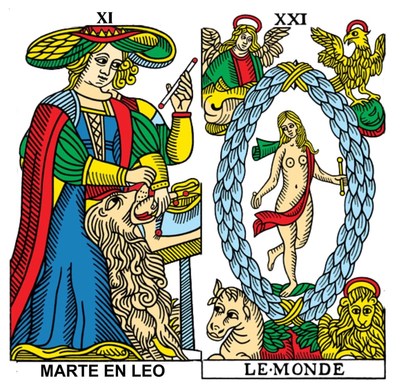 La carta de abajo es el Batallador y representa a Leo, mientras que la que esta superpuesta es la Fuerza y representa a Marte.