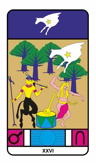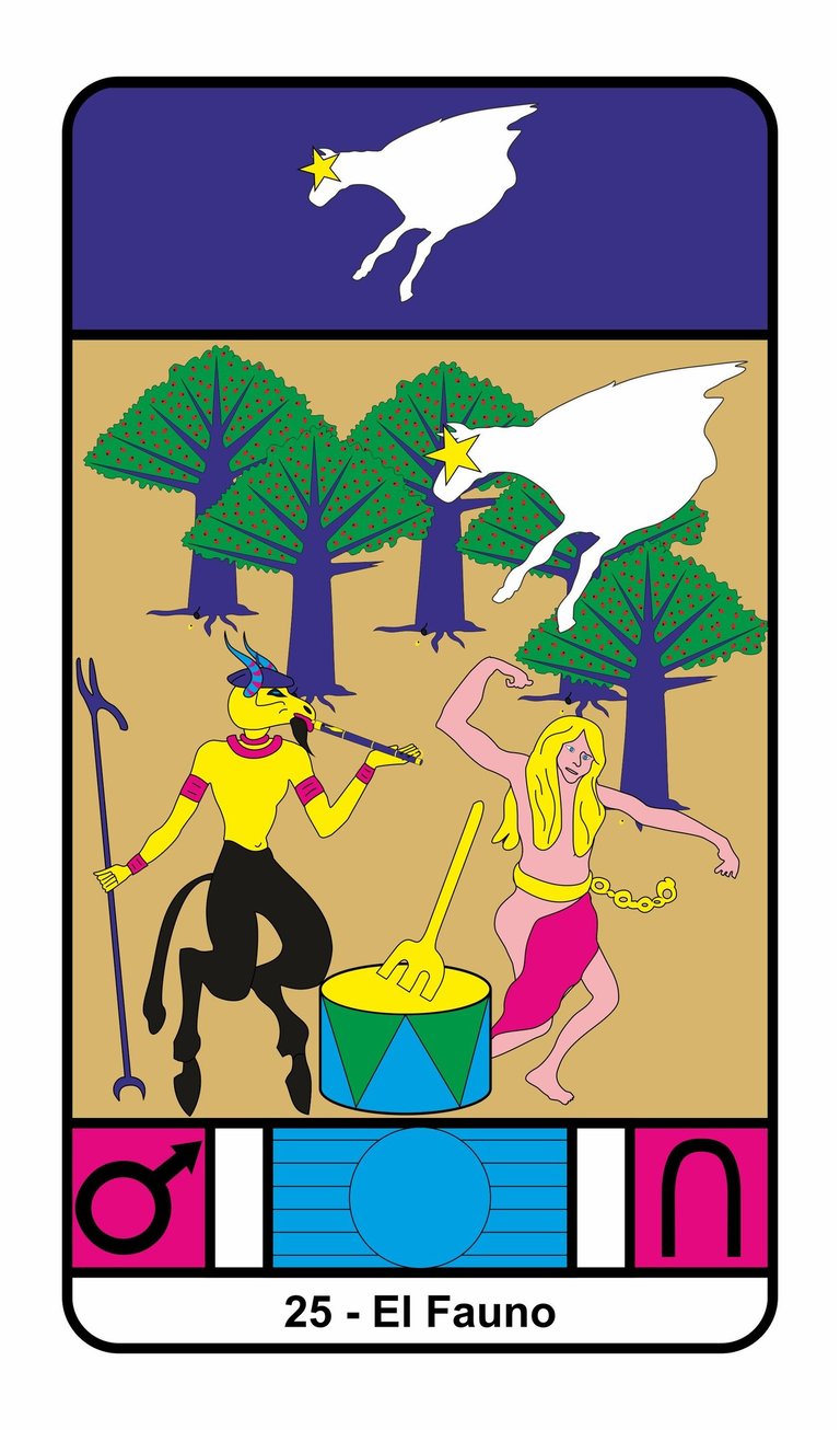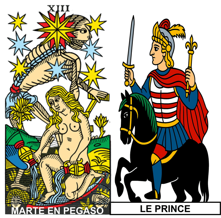 La carta de abajo es la Muerte y representa a Marte, mientras que la que esta superpuesta es la Estrella (Júpiter) y representa a Pegaso.