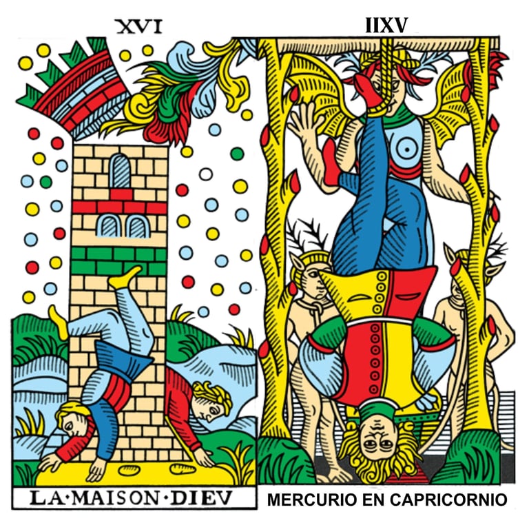 La carta de abajo es el Diablo y representa a Capricornio, mientras que la carta que se superpone es el Colgado y representa a Mercurio.