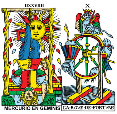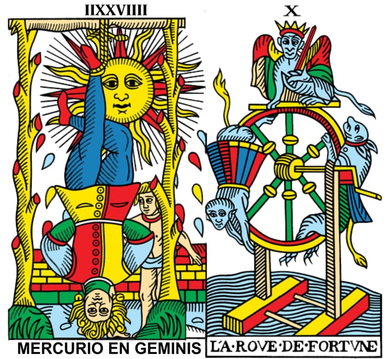 La carta del Sol representa a Géminis, mientras que la que se superpone. el Colgado, representa a Mercurio.