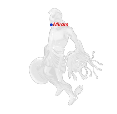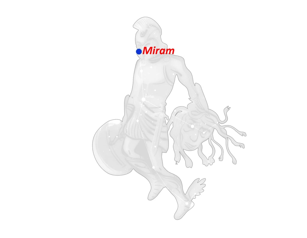 Eta (η) Perseo, Miram, es una estrella doble, 5 y 8.5, naranja y azul pequeño, en el brazo derecho del Campeón.
