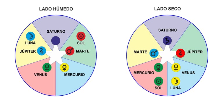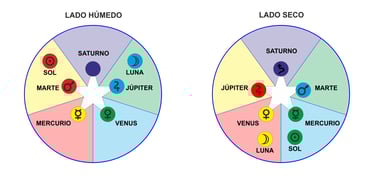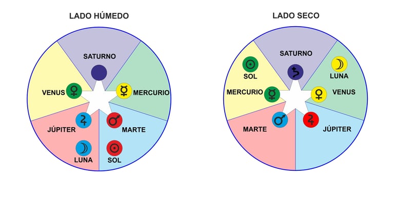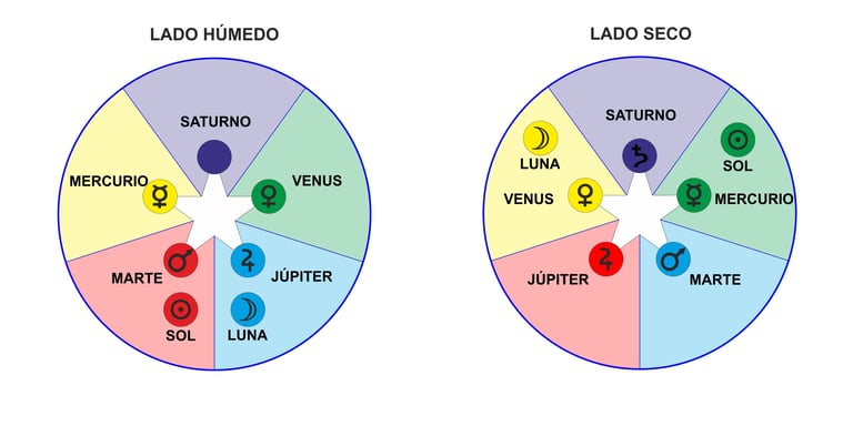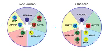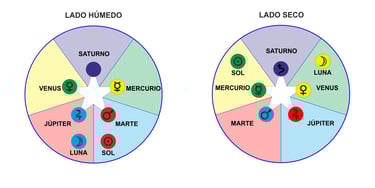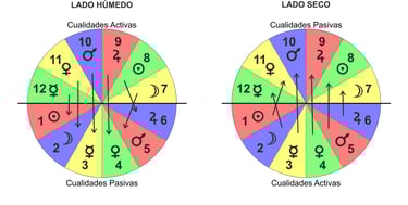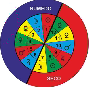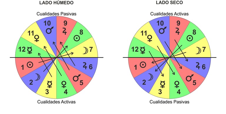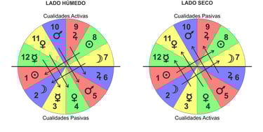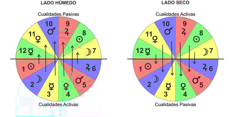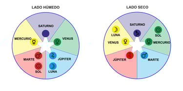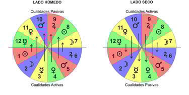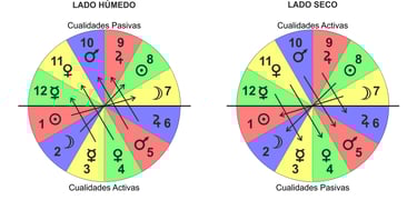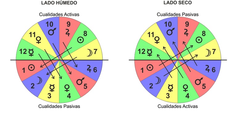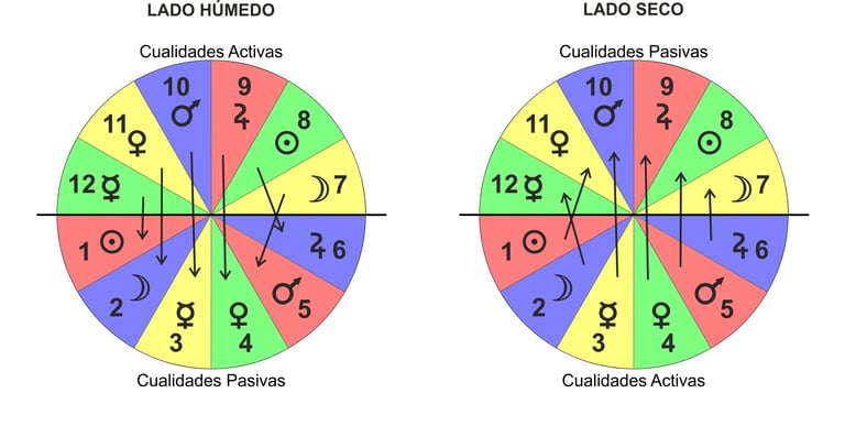 Divido el círculo en dos mitades, una parte seca y otra húmeda. Cuando un planeta está en la mitad correspondiente a una de sus casas, éste adquiere las cualidades de la casa perteneciente a esa mitad. Por ejemplo Mercurio en el lado seco tiene las características del elemento Tierra, mientras que en lado húmedo tiene las características del elemento Aire.