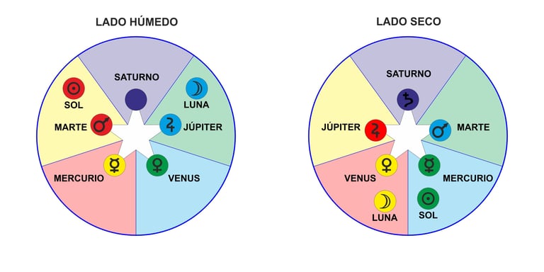 Sabiendo que los planetas se comportan de diferente manera en el lado seco que en el lado húmedo, excepto Saturno que posee características del elemento Aire (cálido y húmedo) en los dos lados, tienen diferentes cualidades primitivas.