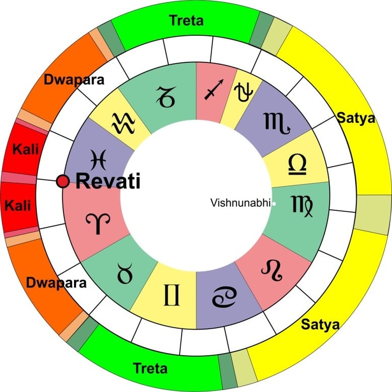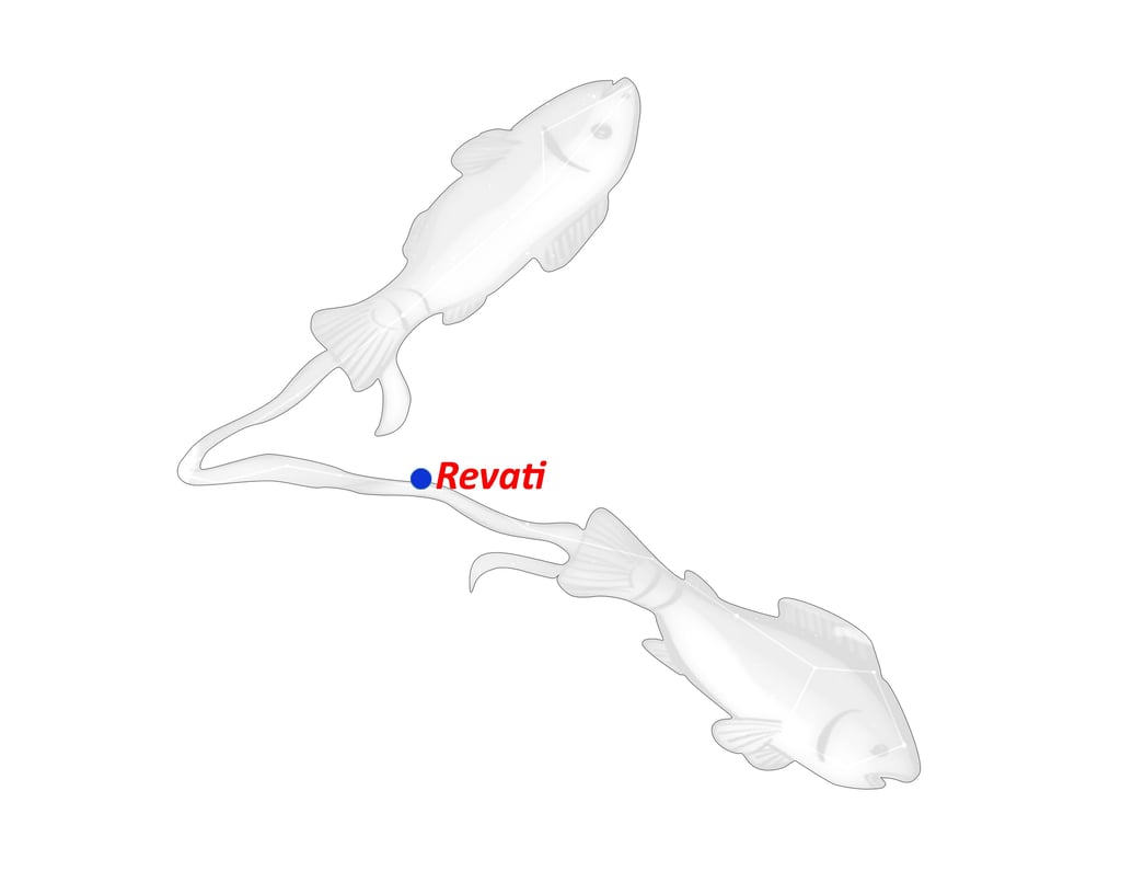 Revati era la única hija del rey Kakudmi, un poderoso monarca que gobernaba Kusasthali, un reino próspero y avanzado bajo el mar, y que poseía grandes extensiones de tierra. Sintiendo que ningún humano podría ser lo suficientemente bueno como para casarse con su hija, el Rey Kakudmi llevó a Revati con él a Brahma-loka (el plano de existencia donde reside el Señor Brahma) para pedirle consejos sobre cómo encontrar un esposo adecuado para Revati. Cuando llegaron, el Señor Brahma estaba escuchando una actuación musical de los Gandharvas, por lo que esperaron pacientemente hasta que la representación finalizó. Entonces, Kakudmi hizo su pedido y presentó su lista de candidatos. Lord Brahma se rió y explicó que el tiempo pasa de manera diferente en diferentes planos de existencia y que durante el corto tiempo que habían esperado en Brahma-loka para verlo, 27 catur-yugas (Naksatras) habían pasado en la Tierra. El Señor Brahma dijo que todos los que has elegido ya han muerto y también tienen muchas generaciones de sus descendientes. Ahora, Kali Yuga está por llegar y Kakudmi debe encontrar a Revati otro esposo. Le dijo al rey que no se sintiera orgulloso porque el Señor Vishnu estaba encarnado en la tierra como Krishna y su hermano mayor Balarama, la encarnación de Adi Shesha. Balarama sería el esposo ideal para Revati. Encontraron a Balarama y propusieron el matrimonio. Debido a que ella era de una edad más temprana, Revati era mucho más alta y más grande que su futuro esposo, pero Balarama, golpeó su arado sobre su cabeza y se encogió a la altura normal de la gente en ese Yugas. Este mito vincula a Revati con el viaje en el tiempo y la relatividad del tiempo: cómo significa diferentes cosas para diferentes personas. El tiempo de Dios es diferente al tiempo humano y a medida que se desarrollan pueden moverse en diferentes dimensiones de tiempo y esto a veces puede hacer que sea difícil establecerse en el mundo en el que se encuentran.