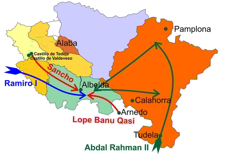 En Tudela es sitiado Musa ibn Musa Banu Qasi, quien tiene que capitular, y el ejército del emir se encamina hacia Pamplona a fin de subyugar a los inquietos vascones. Musa, aliado con Garsiya ibn Wannaqo (García Iñiguez), aunque otros dicen que Fortún ibn Wannaqo (tío de García, hermano del rey Iñigo Arista), le opuso cerca de Pamplona unos nutridos contingentes humanos a base de sus propias gentes, más las de los Sarataniyyin, los Yilliquiyin y los de Alaba y al-Qila (los castillos).