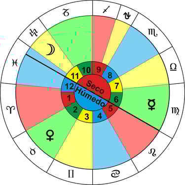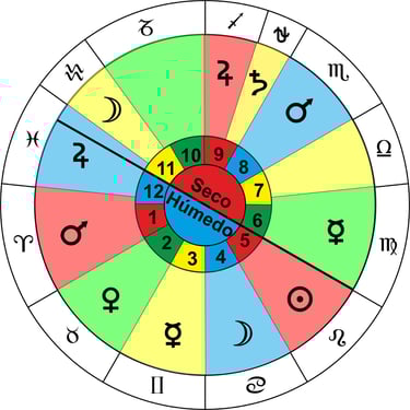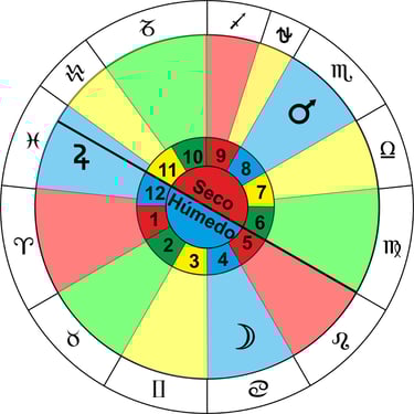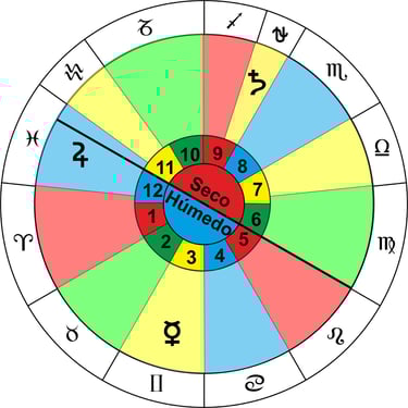 En el elemento Fuego el regente húmedo es el Sol que es regente de Leo (Casa 5), el seco es Saturno que se exalta en Sagitario (Casa 9) y como participativo Marte que es regente de Aries (Casa 1) el cual tiene una parte en la casa 12 que es de agua.