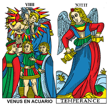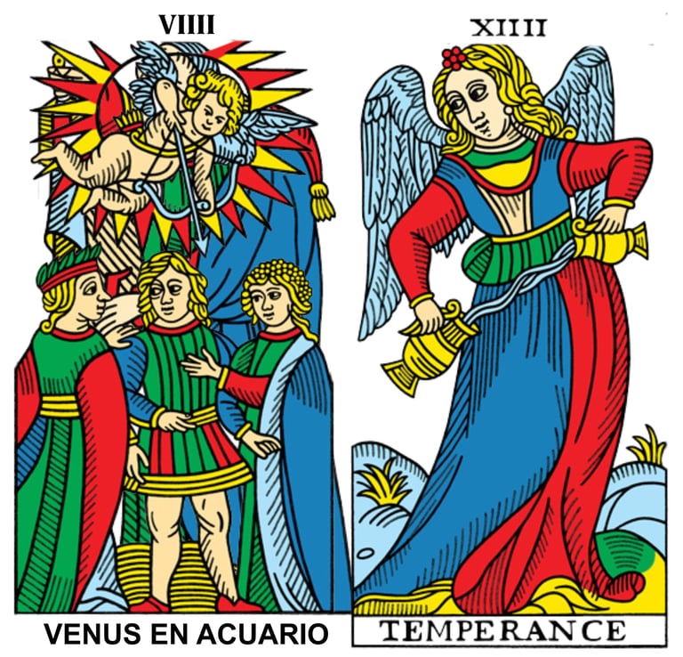 La carta de abajo es el Eremita y representa a acuario, mientras que la que se superpone, los Enamorados, representa a Venus