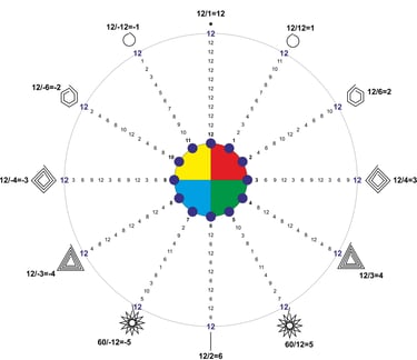 Si tomo 12 como punto más elevado y quito los números angulares (3, 6, 9 y 12), puedo relacionar las formas obtenidas con las diferentes eras o yugas. De tal manera que en el Kali Yuga es una forma caótica en la que tiene cambios bruscos de direcciones, ya en Dwapara Yuga, los movimientos tienen ángulos fuertes, pero más abiertos que en Kali Yuga y ordenados, no caóticos. En Treta Yuga los ángulos son más abiertos, aunque con más ángulos y finalmente, en Satya Yuga es casi un círculo fluído.