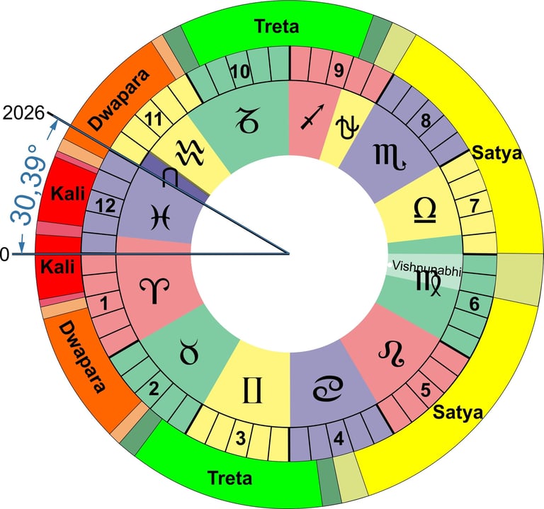 Si el ciclo de precesión fuera de 24.000 años; 360º/24000=0,015º por año; 2026x0,015º=30,39º; por lo que estamos en el inicio de Pegaso y la era de Acuario (casa 11) además de haber entrado en el Dwapara Yuga Ascendente.